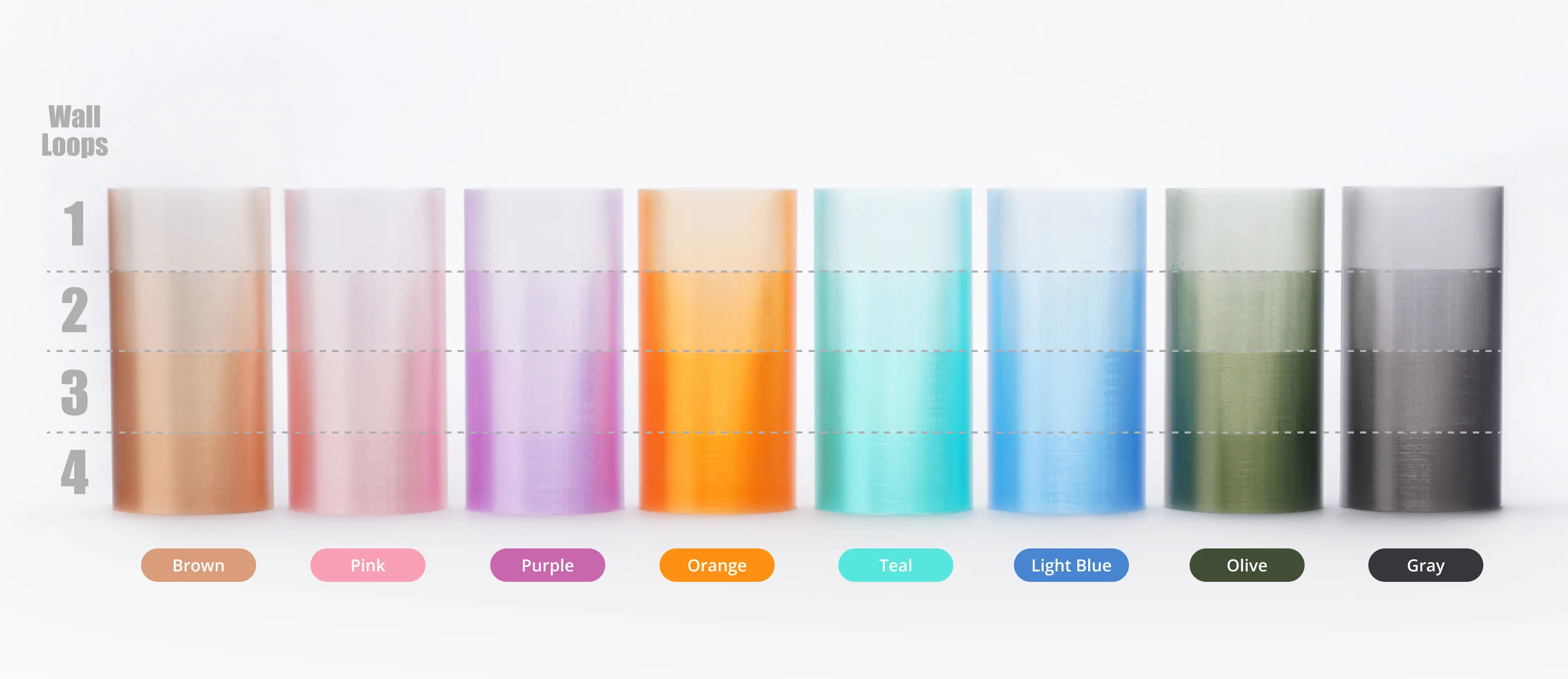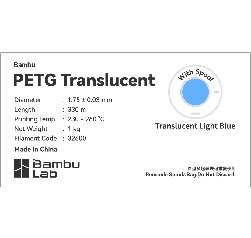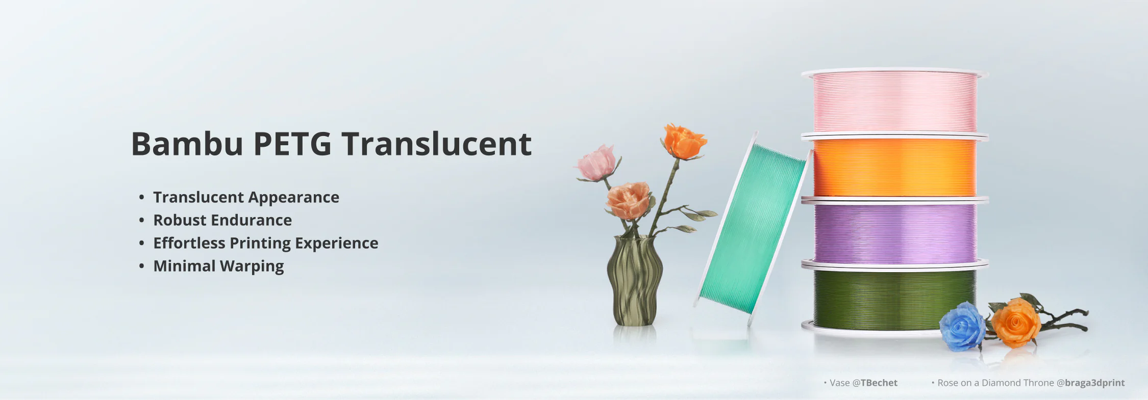 • Printing PETG Translucent with the appropriate print parameters can achieve an appearance ranging from tinted translucent to tinted transparent. Learn more about Printing tips for transparent PETG on WIKI.