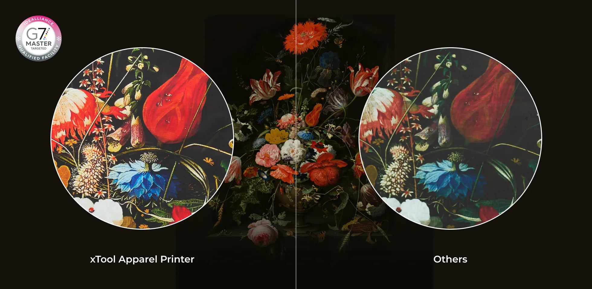 The xTool Apparel Printer ensures consistent prints on all fabrics by precisely controlling the gray balance and tonality. We've invested two years in calibrating the G7 Certified color curve, guaranteeing accurate color reproduction and reducing the need for frequent adjustments.